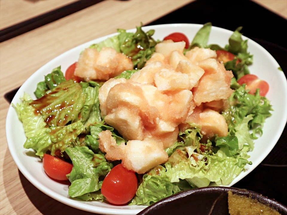 長芋と明太子のサラダ、長芋のシャキシャキ食感がめっちゃいい?!大きめカットの長芋は、明太子を絡ませてあるから、ピリリと美味いねん。