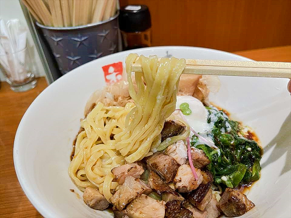 麺は平麺で、めちゃくちゃ冷え冷えで、