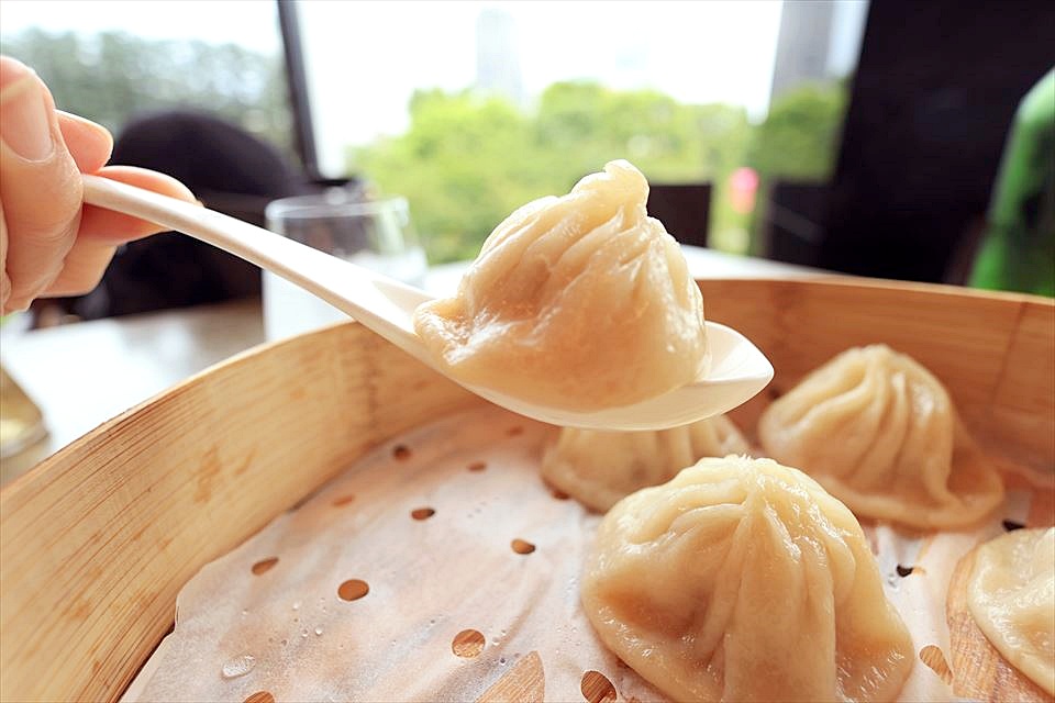 小籠包をレンゲに乗せて、生姜とXO醤を乗せて食べると、