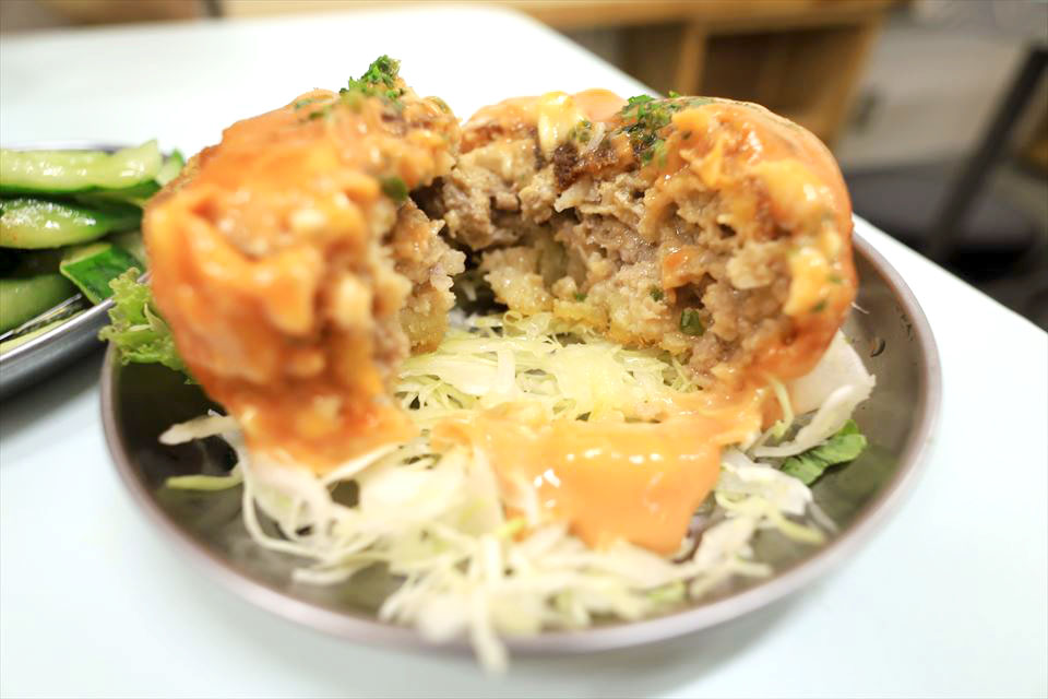 タレの染み込んだキャベツと黄身を絡ませて食べる