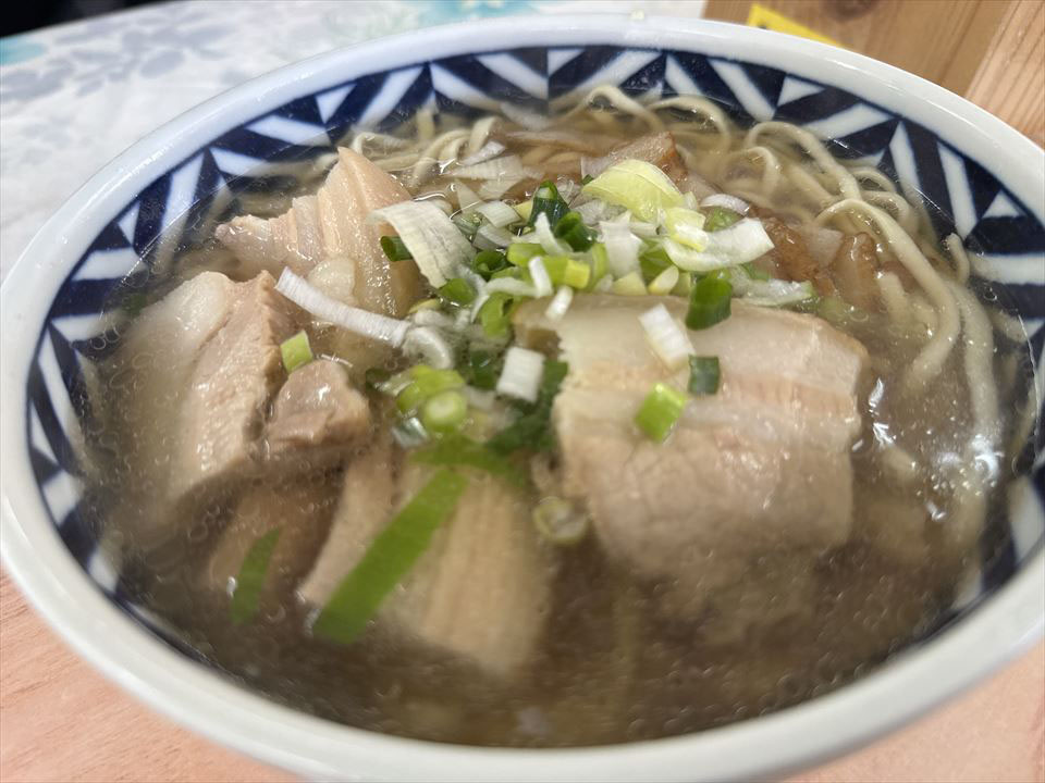 豚バラ肉と沖縄かまぼこ、ネギのシンプルな沖縄そば。