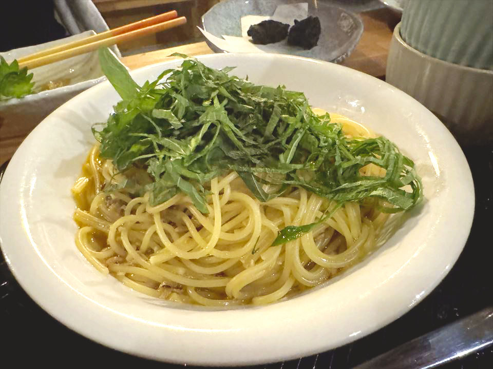 大葉がてんこもりのパスタは、島で取れた白身の魚が入ってて、