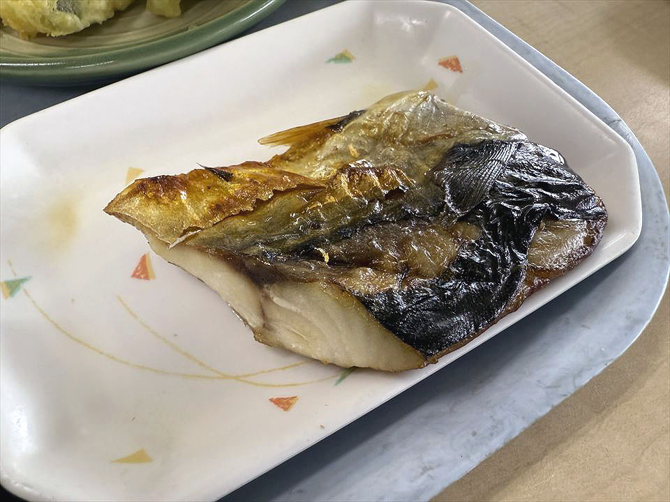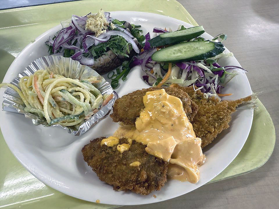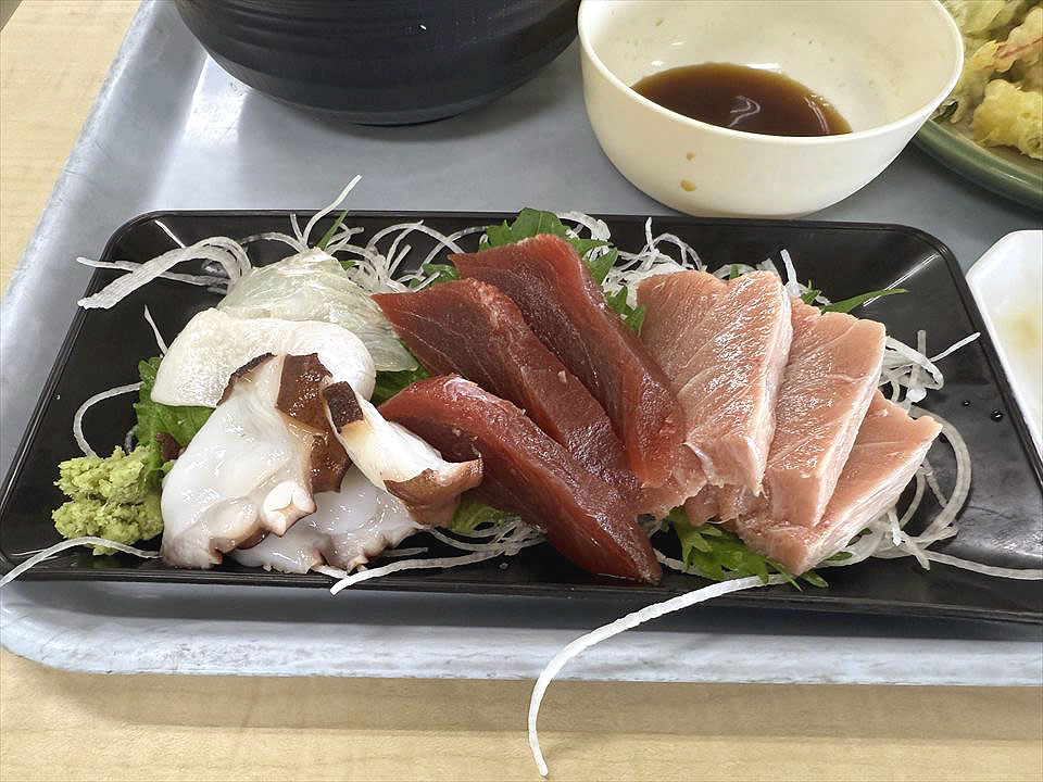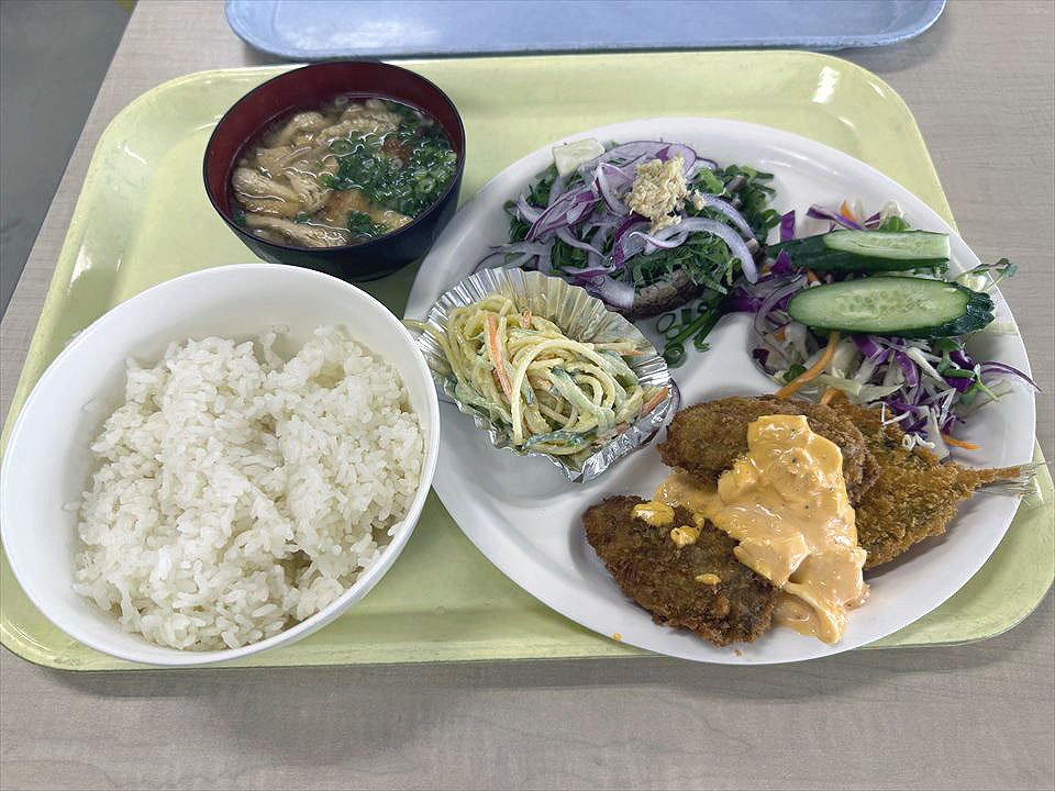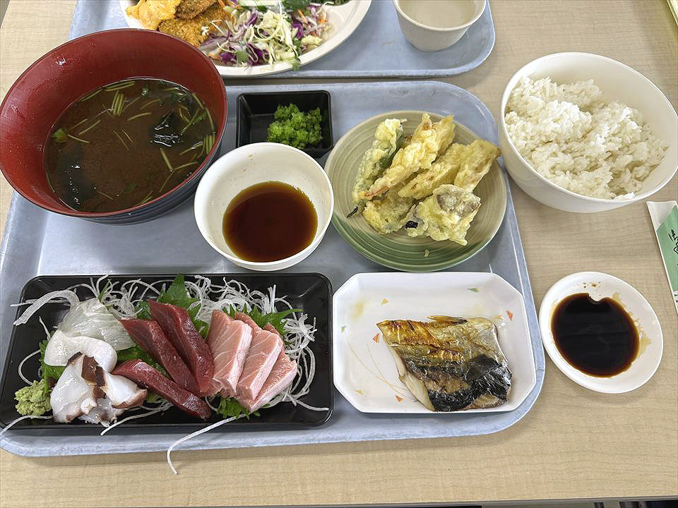 この定食は、朝焼き戻りカツオとカキフライとアジフライ。