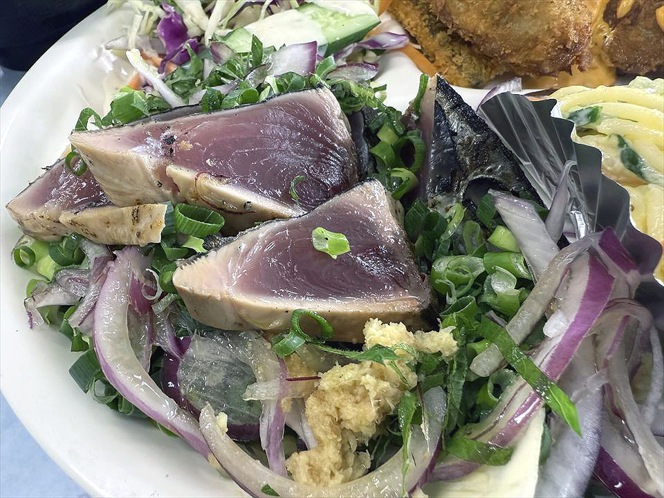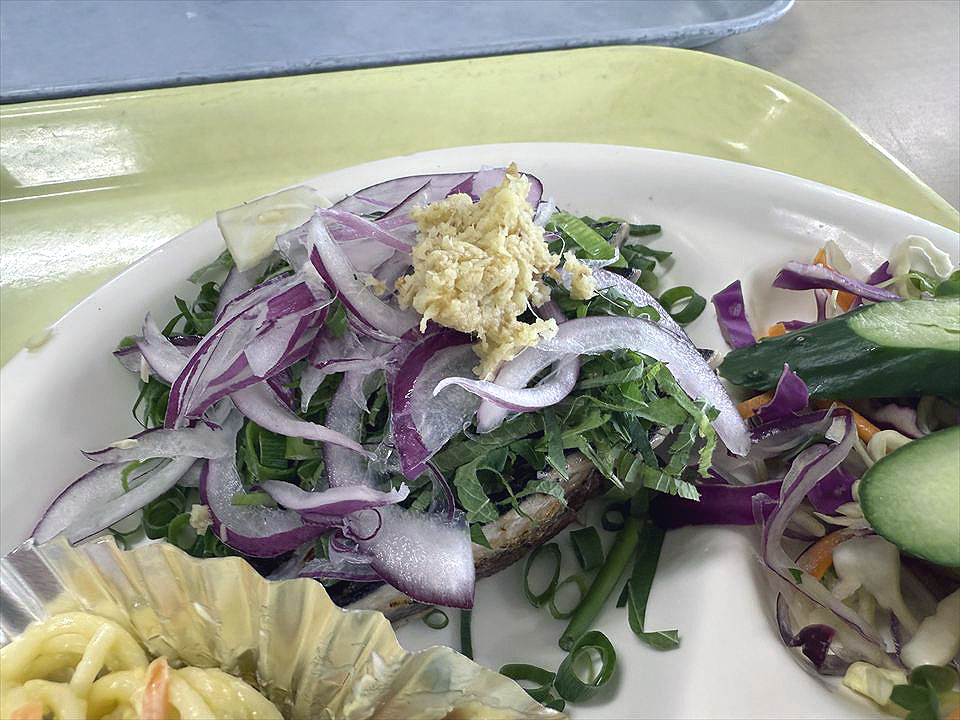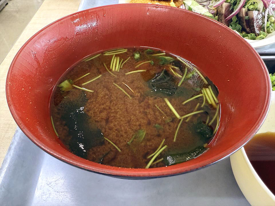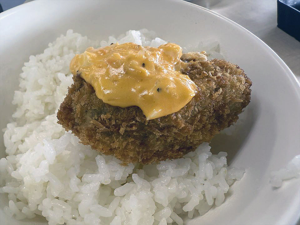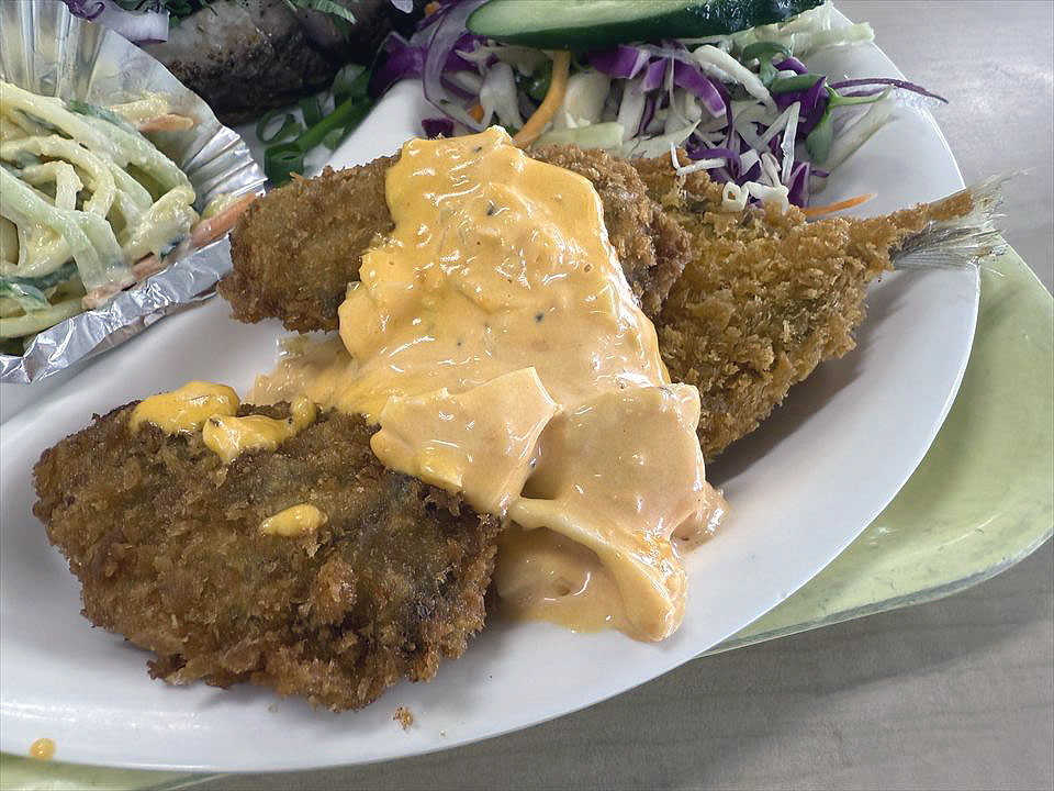 この定食は、朝焼き戻りカツオとカキフライとアジフライ。