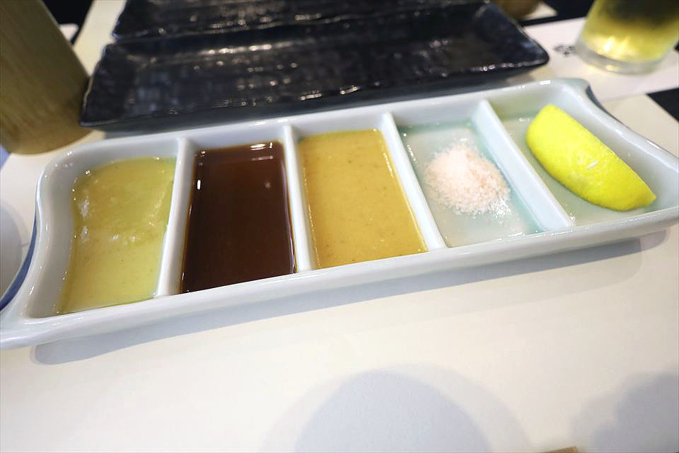 梅ソース、ブレンドソース、ゴマだれ、塩、レモンで。