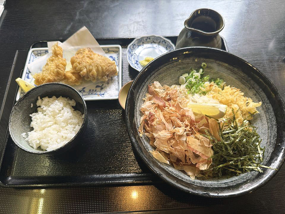 セットは、とり天、白ごはん、好きなうどんが選べて、量も選べるねん。