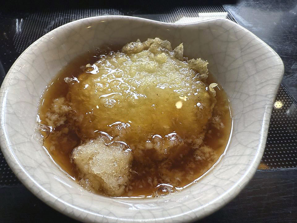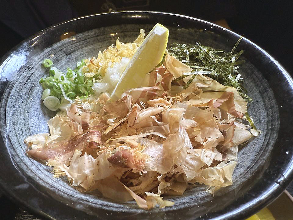 たっぷりの鰹節、大根おろし、きざみ海苔、天かすがのってるねん。