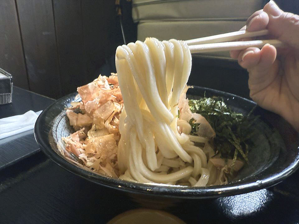 麺は程よくコシがあって、ぶっかけ出汁が合うわぁ。鰹節がええ感じ!