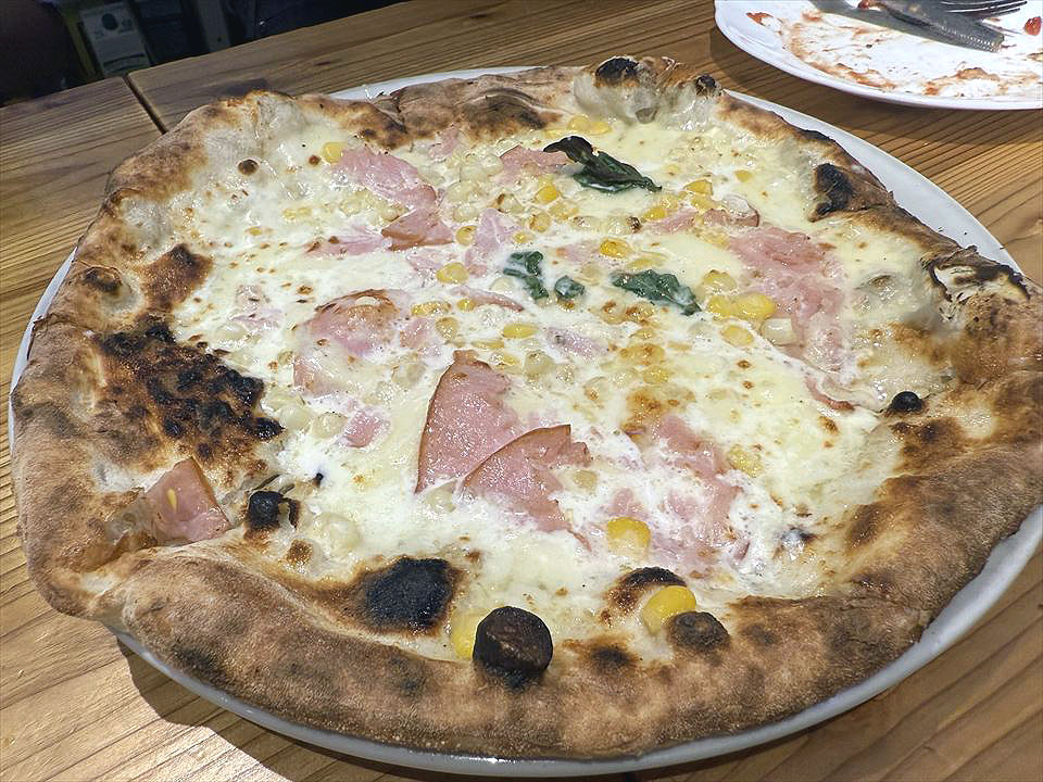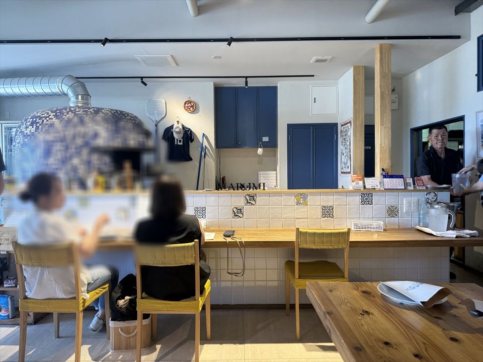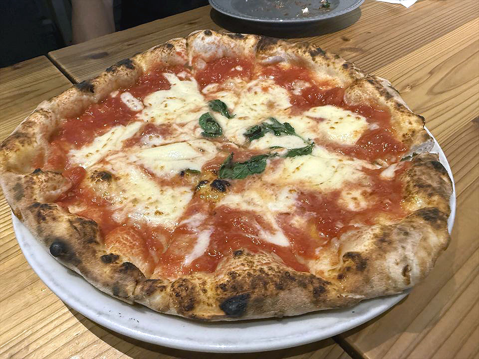 店内に大きなピザ窯があって、ええ匂いしてるわぁ。
