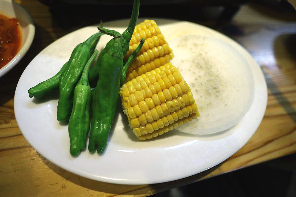 焼き野菜はシシトウ、とうもろこし、玉ねぎ。