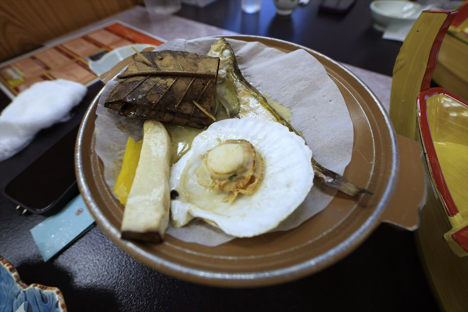ハタハタ、ホタテ、里芋と魚の朴葉焼き、