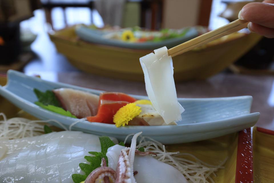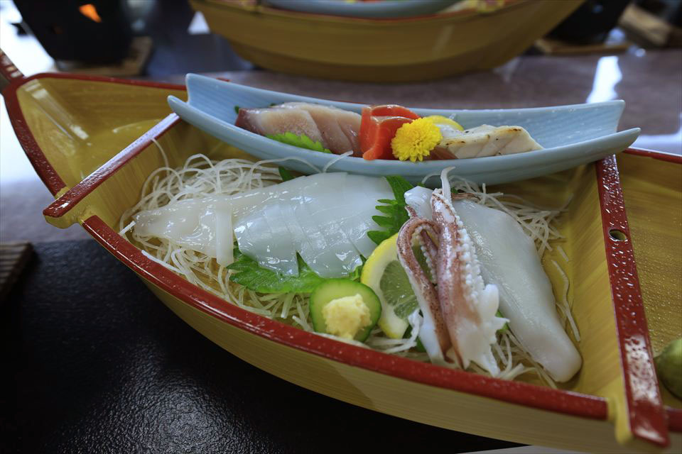白いか姿造り、カンパチ、サーモン、サワラの炙り。