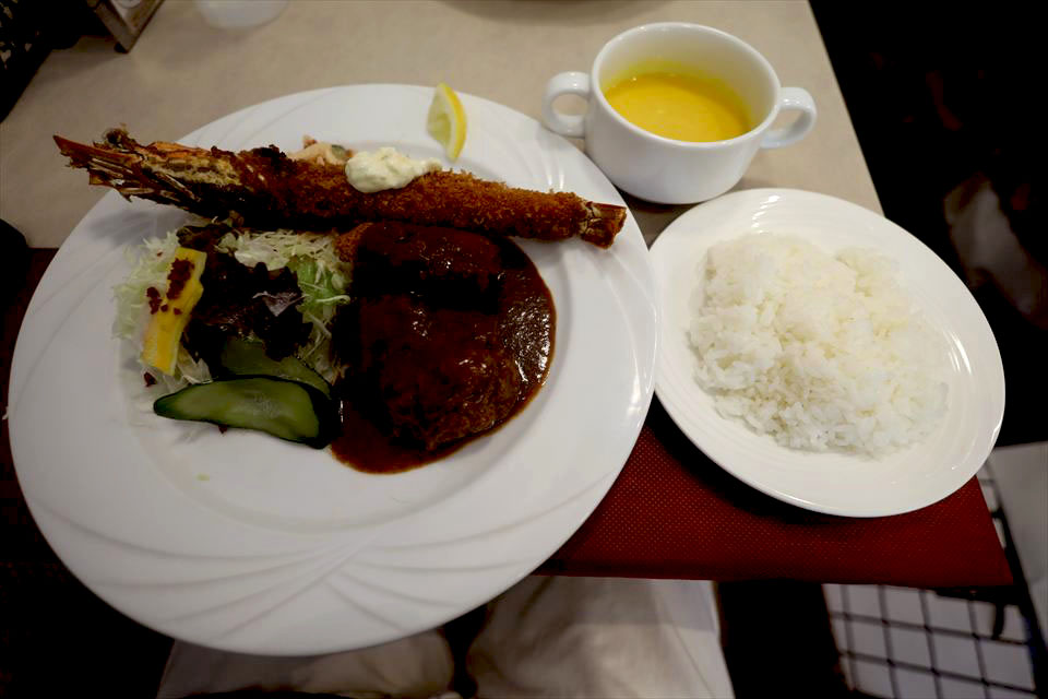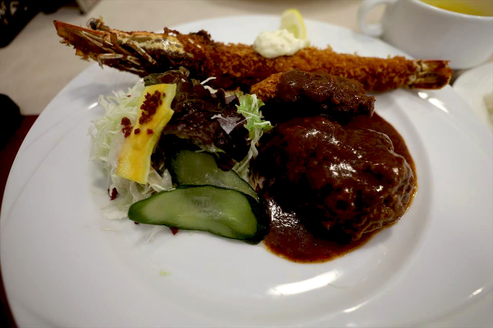 チキンカツ、淡路牛煮込みハンバーグ、エビフライのセット。