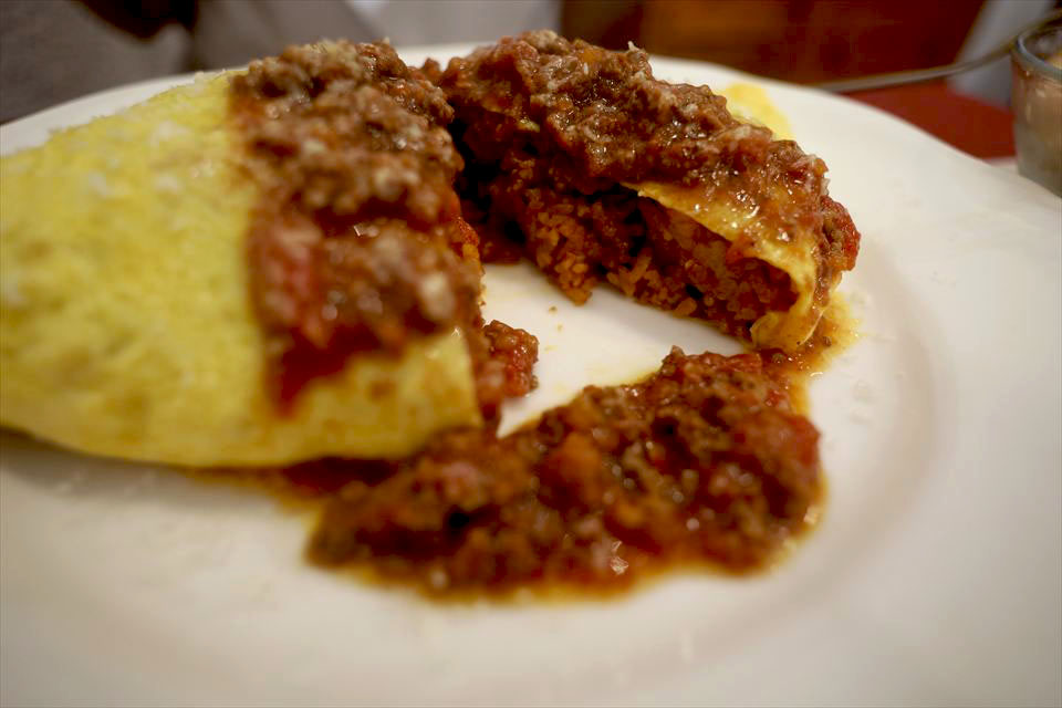 トマトソースが美味いご飯と卵、たっぷりお肉のソースが絶品!