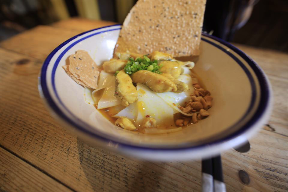 麺は米粉の面で、めちゃくちゃ幅広くてモチモチツルツル、