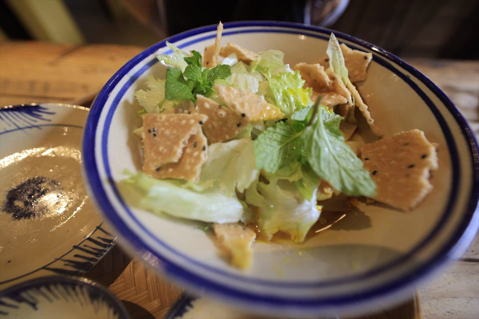 お煎餅みたいなんをパキパキわって、野菜も入れて、