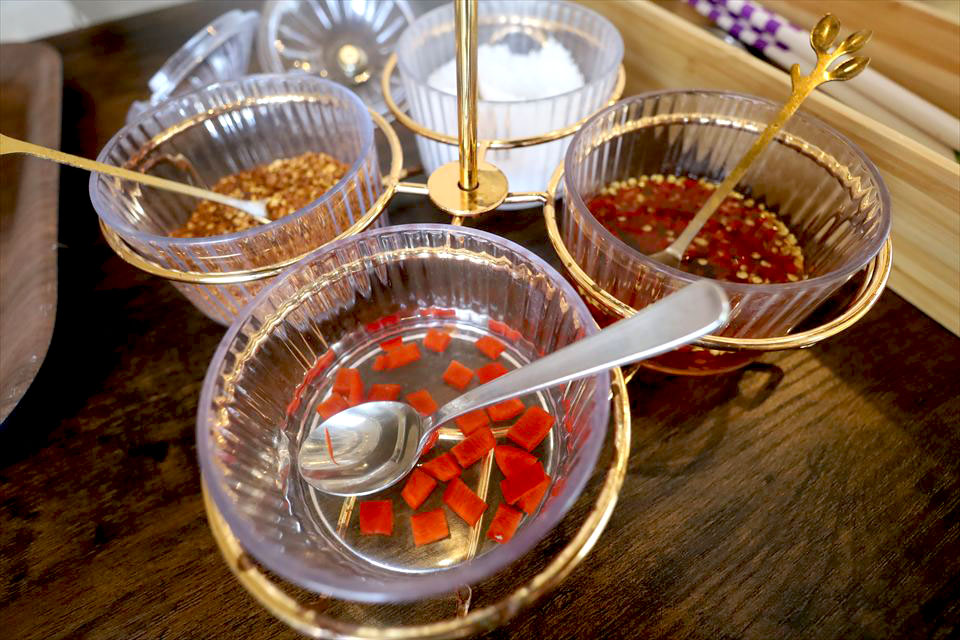 卓上に唐辛子、酢、ナンプラー、