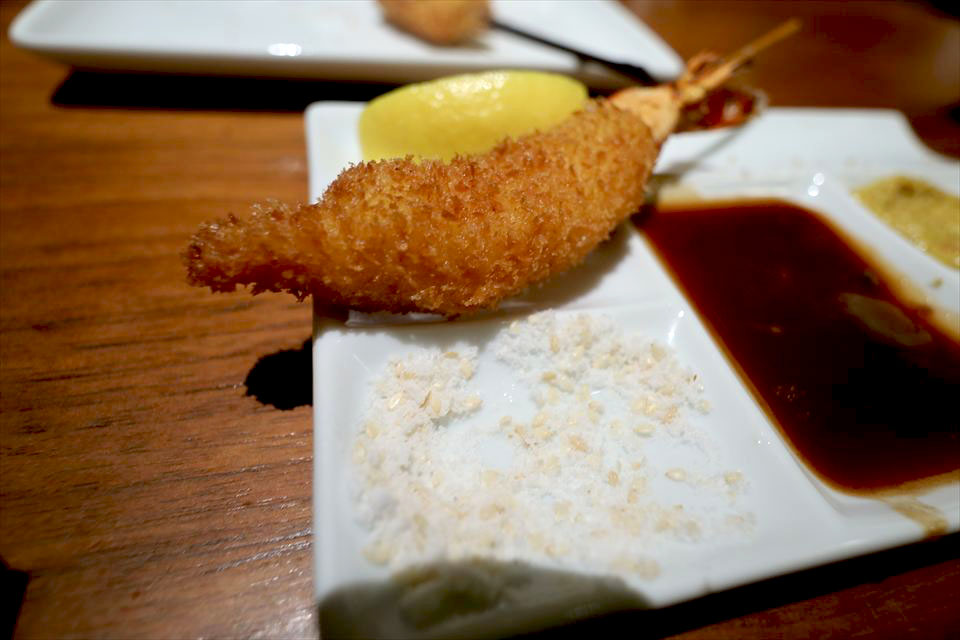 串カツは串の坊ソース、特製ポン酢、ごま芥子ソース、岩塩、カラシで。