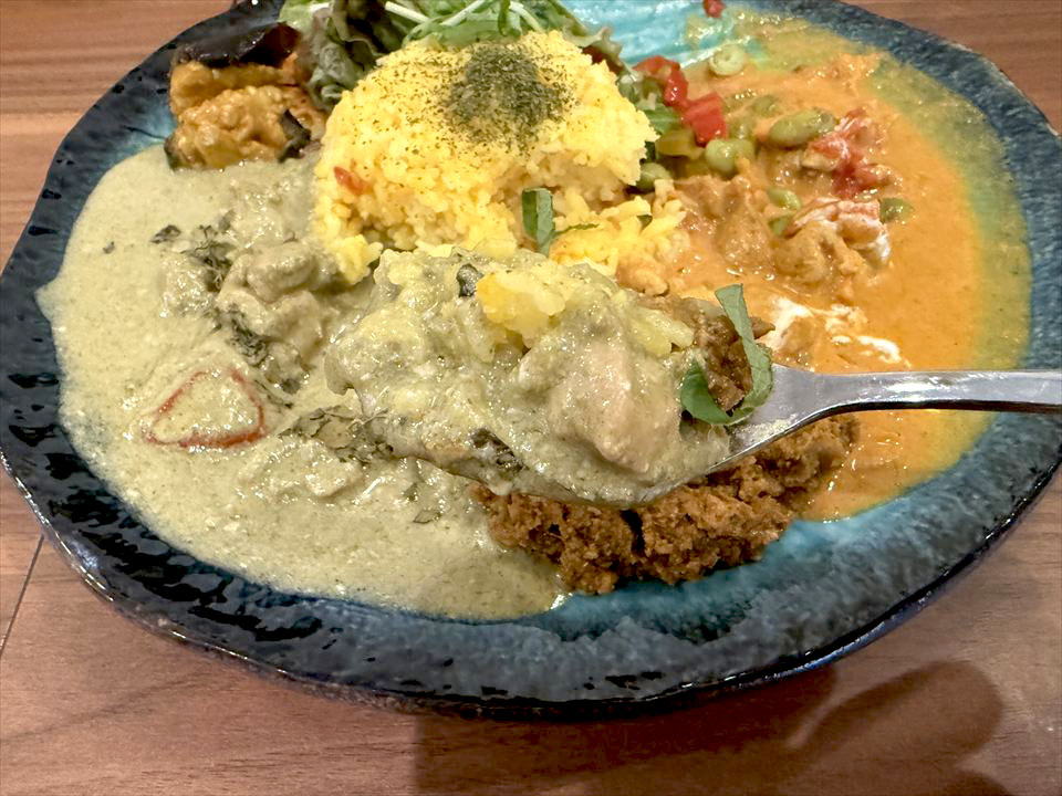 グリーンチキンコルマの3種あいがけ。