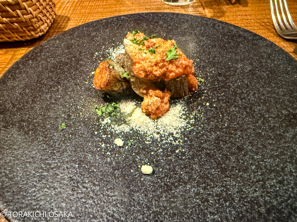 「揚げなすのボロネーゼソース牛タン添え」