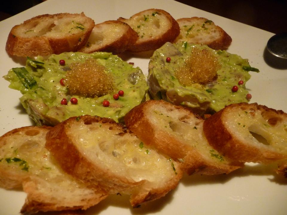 「平政とアボガドのタルタル ガーリックトースト添え」